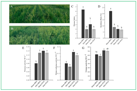 3.2. Soil Resistance-Related Enzyme Activity in the Rice Intercropping System