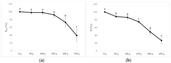 The results revealed a significant inhibition potential of A. altisisma VOCs on B. pilosa seed germination. In particular, the chemicals released from the plant material significantly reduced total germination (GT %) and speed (S %). The S parameter was significantly inhibited (≈12%), even at the lower treatments (50 g and 100 g), increasing up to 73% at the highest concentration assayed (250 g of plant material) (Figure 1). Conversely, the lowest treatments (from 50 g to 150g) did not affect the GT parameter. The 200 g treatment caused 27% inhibition, reaching 60% at the highest concentration (Figure 1). It should be noted that, enlarging the end of the experiments to 13 days, almost all seeds were germinating, even at 250 g treatment.