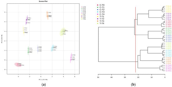 The separation trend observed during the unsupervised PCA was further investigated by the cluster analysis, which highlighted the formation of three main groups (Figure 2). The first group was formed by the control seeds at T0 (C-T0) and the treated seeds at T1 and T2 (T-T1 and T-T2). The second group was formed only by the controls at T1 and T2 (C-T1 and C-T2), whereas the remaining treatments formed the third group (C-T3, C-T4, T-T3, and T-T4) (Figure 2).