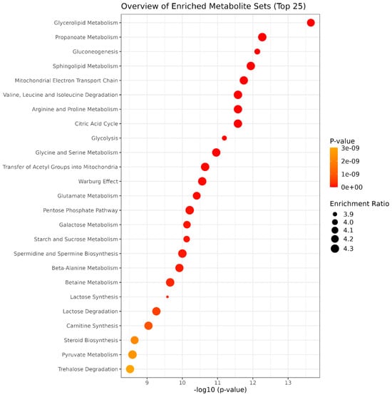 A KEGG-based enrichment analysis, performed to identify the classes of metabolites that were overrepresented in a large set of metabolites, revealed enrichment of glycerolipid and propanoate metabolism; gluconeogenesis; sphingolipid metabolism; mitochondrial electron transport chain; valine, leucine, and isoleucine degradation; arginine and proline metabolism; citric acid cycle; and glycolysis, among others (Figure 3 and Supplementary Table S1).