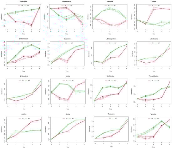 Amino acids with distinctive temporal profiles between control plants (WT) and plants exposed to A. altissima VOCs (TR). The temporal profiles are presented as line graphs based on the two conditions under study: green for the WT and red for the TR. The graphs represent the normalised relative abundance profiles of the amino acids with a good classification score and previously significantly affected by the two-way ANOVA (p ≤ 0.05). N = 4.
