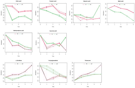 Organic acids and polyamines with distinctive temporal profiles between control plants (WT) and plants exposed to A. altissima VOCs (TR). The temporal profiles are presented as line graphs based on the two conditions under study: green for the WT and red for the TR. The graphs represent the normalised relative abundance profiles of the organic acids and polyamines with a good classification score and previously resulted significantly affected by the two-way ANOVA (p ≤ 0.05). N = 4.