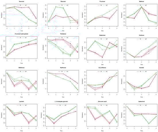 Sugars with distinctive temporal profiles between control plants (WT) and plants exposed to A. altissima VOCs (TR). The temporal profiles are presented as line graphs based on the two conditions under study: green for the WT and red for the TR. The graphs represent the normalised relative abundance profiles of the sugars with a good classification score and previously resulted significantly affected by the two-way ANOVA (p ≤ 0.05). N = 4.