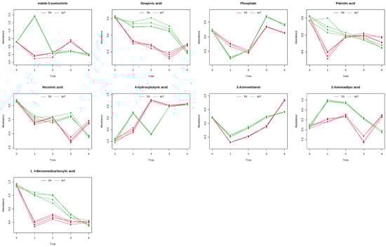 Miscellaneous (molecules belonging to different classes) with distinctive temporal profiles between control plants (WT) and plants exposed to A. altissima VOCs (TR). The temporal profiles are presented as line graphs based on the two conditions under study: green for the WT and red for the TR. The graphs represent the normalised relative abundance profiles of the different classes of compounds with a good classification score and previously resulted significantly affected by the two-way ANOVA (p ≤ 0.05). N = 4.
