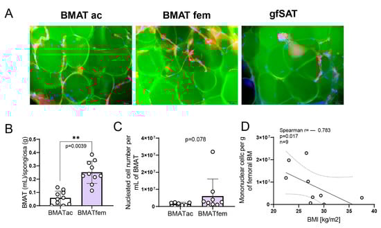 Human bone marrow adipose tissue (BMAT) and the importance of skeletal sites and BMI. (A) Fluorescent staining of neutral lipids (green), F-actin (red), and the nucleus (blue). Representative images are presented. Scale bar is 10 µm. (B) BMAT content in acetabular and femoral bone marrow. (C) Number of nucleated cells per mL of BMAT counted in BMAT ac and BMAT fem isolated after collagenase digestion. (D) Linear regression with the correlation coefficients of patient BMIs and the distribution of bone marrow mononuclear cells. Non-normally distributed values were analyzed with the Mann–Whitney test, where ** p < 0.01. Results are shown as mean ± SD.