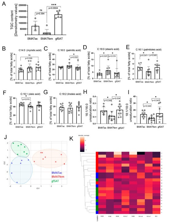 Exploratory lipid content and fatty acid profile analysis. Individual FA proportion in adipose tissues isolated from acetabulum, femur, and gfSAT (n = 10). (A) Triglyceride content determined by thin-layer chromatography. (B–G) FA ratios were calculated from proportion of total fatty acids. (H,I) Unsaturation ratios of 16:0/16:1 and 18:0/18:1 FAs. Non-normally distributed values were analyzed with one-way ANOVA following Dunne’s post hoc test, where * p < 0.05; *** p < 0.001. Results are shown as mean ± SD. Differentiation of body sites based on fatty acid compositions of adipose tissues using (J) linear discriminant analysis and (K) clustered heatmap obtained using the Mahalanobis metric and method average.