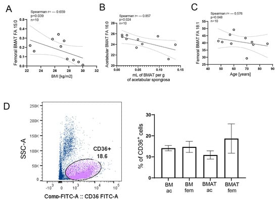 After observing site-specific differences in the adipose tissue of patients undergoing hip arthroplasty, we estimated correlations between FAs and the demographic data of patients and other parameters. Palmitic and oleic acids were shown to be most present FAs in BMAT ac, BMAT fem, and gfSAT. Our results showed a decrease in essential FAs, although there was a minor amount of pentadecanoic acid (Figure 3A) in BMAT fem related to BMI. The presence of palmitic acid 16:0 in BMAT ac decreased with BMAT content at this skeletal site (Figure 3B). In addition, the frequency of 18:1n-9 (oleic acid) in BMAT fem declined with age of patients (Figure 3C). CD36 is a high-affinity receptor for long-chain FAs that has been shown to facilitate net FA uptake into human adipocytes and regulate lipid metabolism []. As we observed different patterns of triglycerides and FAs in BMAT and gfSAT, we assumed that the expression of CD36 might be associated with shown differences. However, we could not find significant differences in CD36 expression in cells within BM and BMAT (Figure 3D).
