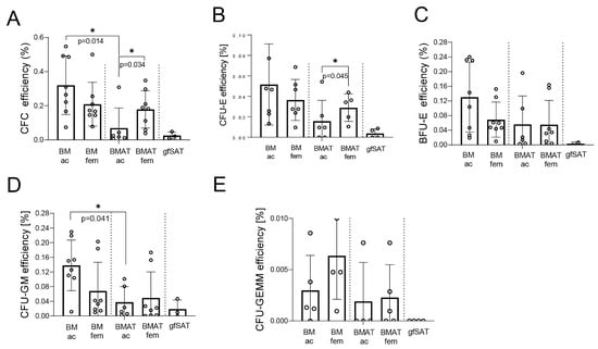 Committed hematopoietic progenitors distributed in BMAT from different skeletal sites. Presence of committed hematopoietic progenitors represented as (A) total CFC; (B) CFU-E; (C) BFU-E; (D) CFU-GM; and (E) CFU-GEMM. Non-normally distributed values were analyzed with one-way ANOVA following Dunne’s post hoc test, where * p < 0.05. Results are shown as mean ± SD.