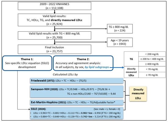 This retrospective cohort study analyzed the de-identified data from the Korean National Health and Nutrition Examination Survey (KNHANES) conducted between 2009 and 2022. We included subjects with valid lipid results, specifically those with direct LDLc measurements obtained using the enzymatic method (Labospect 008AS, Hitachi, Tokyo, Japan). We excluded subjects with TG levels ≥ 800 mg/dL or those under 19 years of age. The final analysis comprised 23,757 subjects.