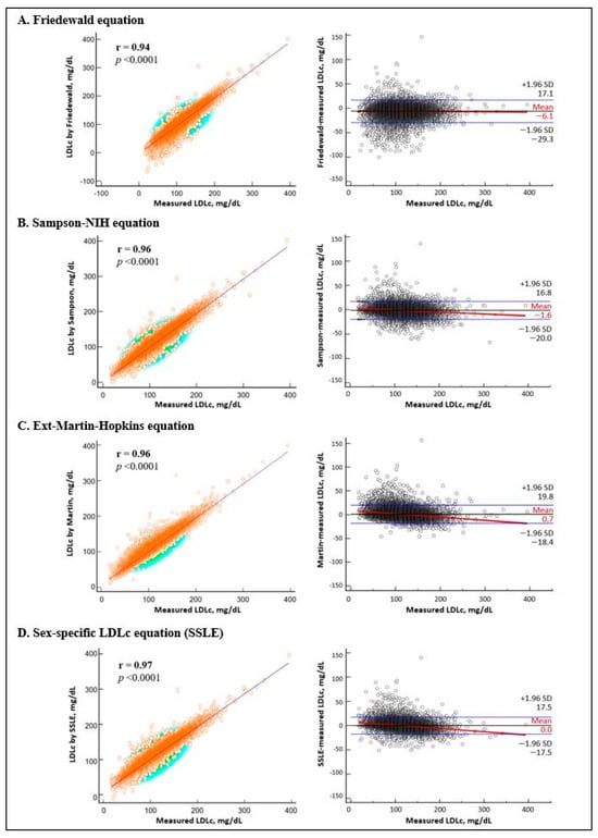 Background/Objectives: The currently established equations for calculating low-density lipoprotein cholesterol (LDLc) do not reflect the sex-specific differences in lipid metabolism. We aimed to develop a sex-specific LDLc equation (SSLE) and validate it with three established equations (Friedewald, Sampson-NIH, and ext-Martin–Hopkins) against direct LDLc measurement in Korean adults. Methods: This study included 23,757 subjects (51% male; median age, 51 years) from the 2009–2022 Korean National Health and Nutrition Examination Survey. We developed the SSLE through multiple linear regression incorporating total cholesterol (TC), high-density lipoprotein cholesterol (HDLc), triglycerides (TG), and sex. The validation metrics included Bland–Altman analysis for mean absolute percentage error (MAPE) and agreement of the categorization based on the NCEP ATP-III guidelines, assessed by sex and lipid subgroups. Results: The derived SSLE equation was as follows: for TG < 200 mg/dL, LDLc = 0.963 × TC − 0.881 × HDLc − 0.111 × TG + 0.982 × Sex − 6.958; for TG ≥ 200 mg/dL, LDLc = 0.884 × TC − 0.646 × HDLc − 0.126 × TG + 3.742 × Sex − 3.214 (male = 1, female = 0). The MAPE was similar between males and females for the SSLE (4.6% for both) and ext-Martin–Hopkins (5.0% vs. 4.9%) but higher in males for the Sampson-NIH (5.4% vs. 4.9%) and Friedewald (7.6% vs. 5.7%). In the TG ≥ 400 mg/dL group, the MAPE increased progressively: SSLE (10.2%), ext-Martin–Hopkins (12.0%), Sampson-NIH (12.7%), and Friedewald (27.4%). In the LDLc < 70 mg/dL group, the MAPE was as follows: SSLE (8.0%), Sampson-NIH (8.6%), ext-Martin–Hopkins (9.7%), and Friedewald (12.8%). At TG 200–400 mg/dL, the SSLE revealed very good agreement (κ = 0.801) versus good agreement for other equations (ext-Martin–Hopkins κ = 0.794, Sampson-NIH κ = 0.782, Friedewald κ = 0.696). Conclusions: The novel SSLE demonstrated superior accuracy and agreement in Korean adults. Further validation studies across different ethnic populations are warranted.