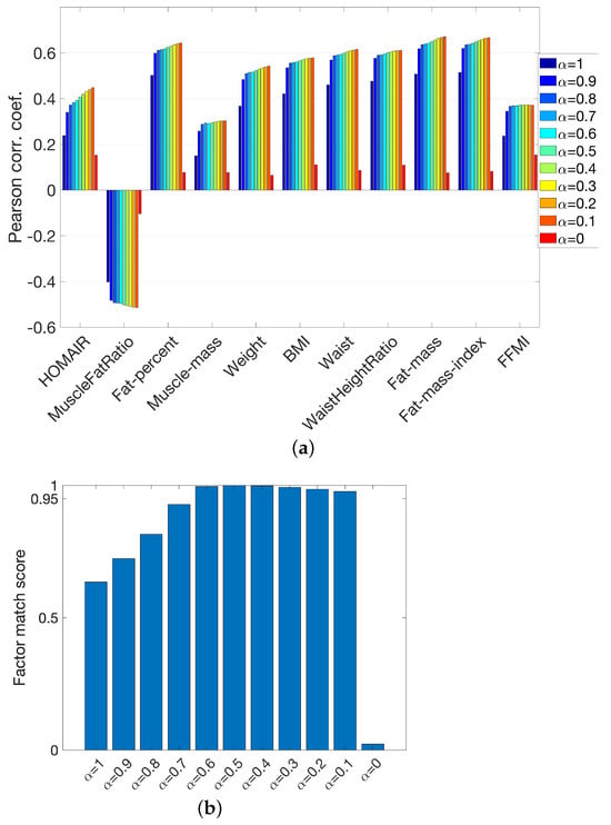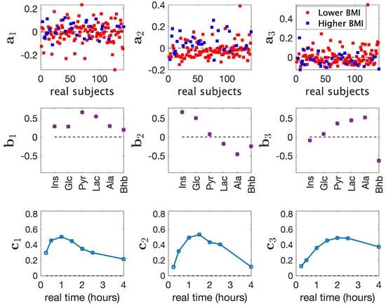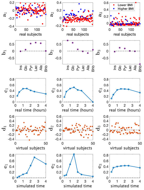 - Step 2. Conflicting pattern construction. The first and third components (from Step 1) were retained, while the second component was modified by introducing wrong prior information. In the default (correct) pattern, Ins and Glc were close to each other, having large positive values in the second component, while values of the remaining metabolites were close to zero. We broke down the positive association between Ins and Glc and set the loading values of Ins, Glc, Pyr, Lac, Ala, and Bhb to 1, −1, 0, 0, 0, and 0, respectively (the factor vector was then normalized, i.e., divided by its two-norm). See Figure S6b in Supplementary File for the modified pattern. This is wrong prior information for the real data, which consisted of healthy subjects, and no such relation between Ins and Glc was expected.