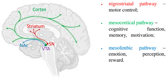 Approximately 80% of brain dopamine is released by the axons of neurons in the nigrostriatal pathway. These are primarily neurons in the substantia nigra and the lateral part of the ventral tegmental area [72]. Moreover, neurons in the first of these sections project to the dorsal striatum, and neurons in the second section project to the nucleus accumbens (NAc) of the brain [70]. Another equally important dopamine system in the brain is the mesocortical part.