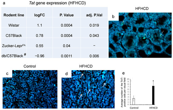 Differential expression of the Tat gene (a) and immunohistochemical analysis (a–d) of kidney (b) and liver (c–e) tissue samples from mice and rats of different lines on the background of consumption of a diet with excess fats and carbohydrates (HFHCD) [131,132,133]. Arrows indicate areas of the TAT protein expression. *—p < 0.05 compared to the control group; #—control diet.