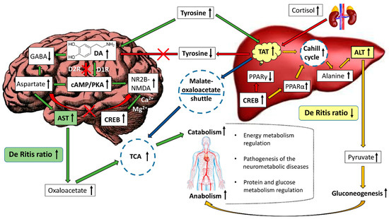 Several authors note the important role of the De Ritis ratio (the ratio of AST and ALT activities in the blood) in the regulation of metabolic processes in alimentary and other pathological conditions [139,140,141,142,143]. There is very little information on the use of these factors in the functional disorders of monoamine systems diagnosis. The activity of the AST enzyme plays an important role in the regulation of the catabolic and ALT—anabolic reactions. Figure 3 shows the general scheme of AST/ALT-mediated regulation of catabolism and anabolism.