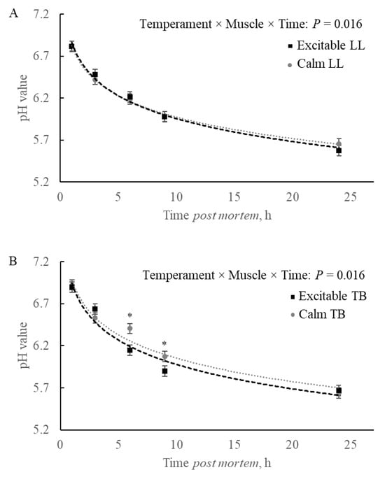 For the pH decline, it was observed a triple interaction between temperament × muscle × time post-mortem (p = 0.016; Figure 1A,B). Comparing groups formed by the temperament and muscles separately and during the time, a post-mortem showed that no difference was observed within the LL muscle (Figure 1A). However, when the comparison was among groups within the TB muscle, the excitable group showed a faster pH decline, with differences observed at 6 and 9 h post-mortem, without differences at initial (1 and 3 h post-mortem) or final pH value (24 h; Figure 1B).