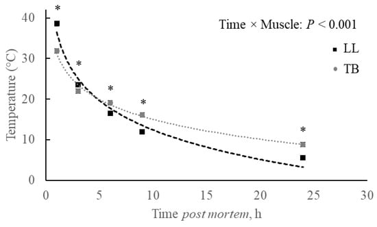 Temperature declines post-mortem in Longissimus lumborum (LL) and Triceps brachii (TB) muscles of Nellore carcasses. * p ≤ 0.05.