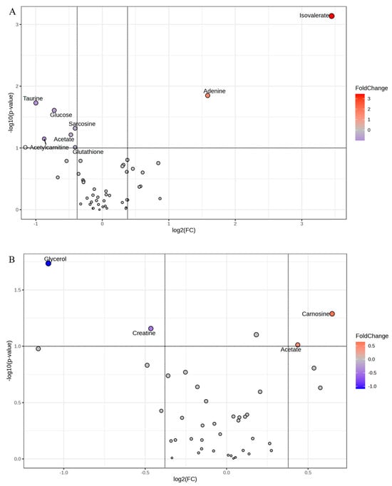 Volcano plot of metabolites in (A) Longissimus lumborum (LL) and (B) Triceps brachii (TB) muscles at 24 h post-mortem of Nellore cattle classified as excitable (blue) or calm (red).