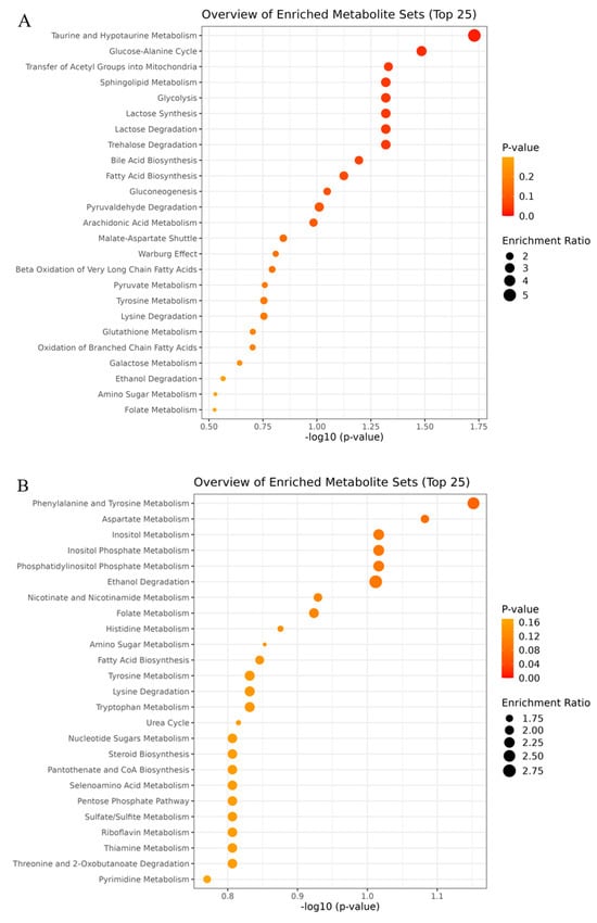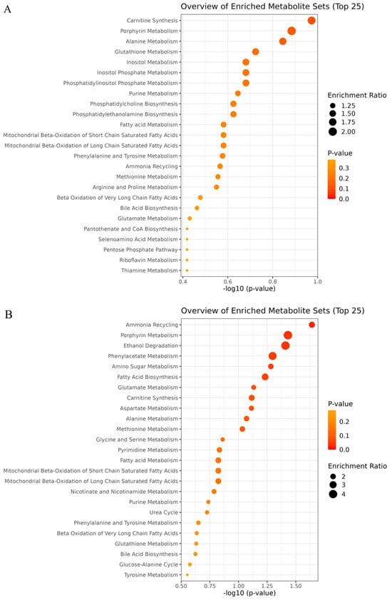 Overview of enriched pathways in (A) Longissimus lumborum (LL) and (B) Triceps brachii (TB) muscles at 24 h post-mortem of Nellore cattle classified as excitable or calm.