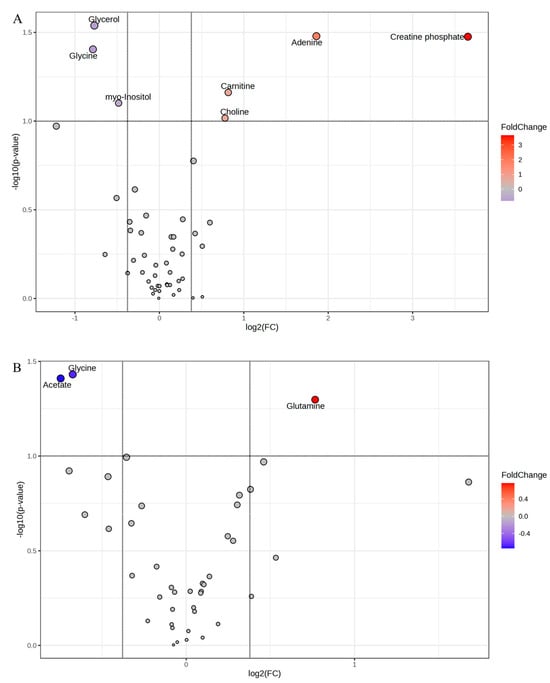 As expected, the scenario changed completely when the metabolites were analyzed in muscle samples collected after 24 h post-mortem. The Volcano plot representing LL at 24 h (Figure 5A) showed that glycerol, glycine, and myo-inositol were greater in excitable animals, while creatine phosphate, adenine, carnitine, and choline were greater in the LL muscle of calm animals. Interestingly, glycerol was also greater in the TB muscle of excitable animals at 1 h post-mortem. For the TB 24 h post-mortem, the volcano plot revealed that glycine (p = 0.037) and acetate (p = 0.038) were greater in muscle of excitable animals, while glutamine was greater (p = 0.050) in muscle of calm animals (Figure 5B). Another interesting observation was that acetate was greater in TB 1 h post-mortem from calm animals.