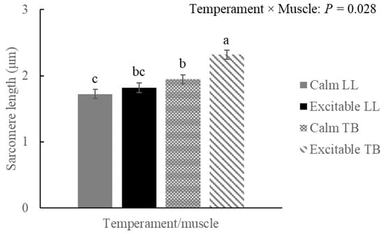 An interaction effect between temperament × muscle (p = 0.028) and a longer sarcomere length was observed in the TB of excitable animals (Figure 7). The comparison within muscle showed a difference among temperaments for TB (p = 0.001) and no difference among groups within LL. However, shorter sarcomere length (p = 0.018) was observed in LL of calm animals when compared to the sarcomere in TB of the same temperament group.