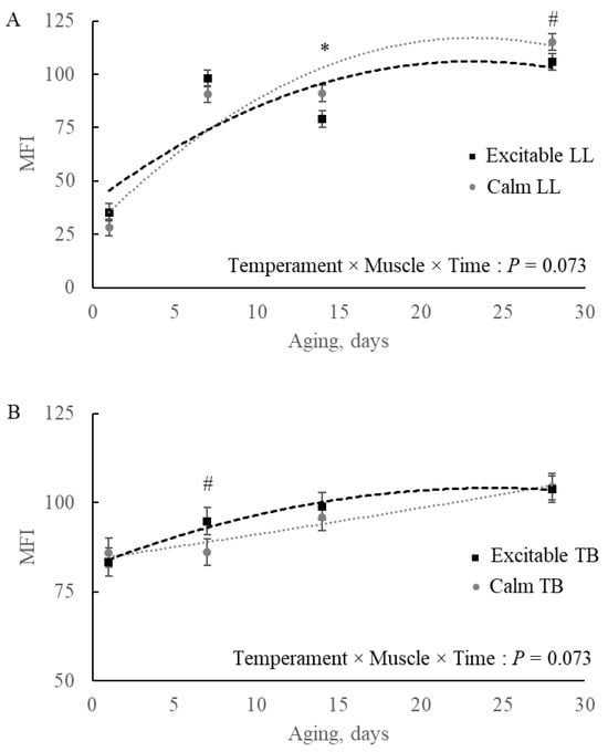 Myofibrillar fragmentation index (MFI) in (A) Longissimus lumborum (LL) and (B) Triceps brachii (TB) muscles during 28 d aging in beef of Nellore cattle classified as excitable or calm. * p ≤ 0.05; # 0.05 < p ≤ 0.10.