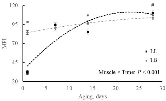 The comparison of MFI progression among muscles during the aging period revealed that the LL showed less fragmented myofibrillar proteins at initial aging (p < 0.001), reaching the same fragmentation as TB by day 7 and surpassing the fragmentation observed in TB by the final aging day (p = 0.062; Figure 9).