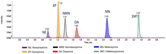 - Shushan, B.; Roberts, W.L.; Frank, E.L.; Urry, F.M.; Kushnir, M.M. Analysis of Catecholamines in Urine by Positive-Ion Electrospray Tandem Mass Spectrometry. Clin. Chem. 2002, 48, 323–331. [Google Scholar] [CrossRef]