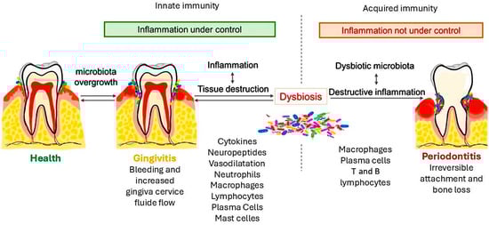 As already mentioned in periodontitis, the oral microbiota goes through dysbiosis. Such a condition determines that periodontal cells are exposed to bacterial products for a long time, leading to the accumulation of senescent cells that relapse pro-inflammatory cytokines.