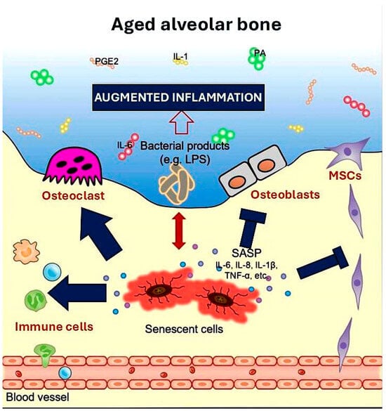 Chronological senescence related to age augments the number of senescent cells in many tissues [71,72]. Even though they are not numerous (~1–10%), these cells cause tissue dysfunction in several ways. First, cellular function is dramatically impaired when cells become senescent, which can impair normal tissue function in an autocrine behaviour. Second, senescent cells can impair the function of neighbouring cells by making them senescent or by damaging their differentiation potential, impairing tissue function in a paracrine manner. Third, senescent cells secrete SASP components, contributing to age-related diseases and frailty etiology. The SASP mediates many of the pathophysiological effects of senescent cells, including promoting inflammation and distributing toxic substances to nearby cells, which can increase senescent cell accumulation and tissue dysfunction. In periodontal tissues, the growth of senescent cells with ageing, particularly those producing SASP, contributes to alveolar bone loss and increased susceptibility to periodontitis in the elderly. Recent studies indicate that the load of senescent osteocytes in alveolar bone increases with age. These senescent osteocytes produce SASP, which interacts with bacterial substances linked to periodontal inflammation and heightens cytokine production, which is crucial in developing inflammation. Moreover, these cytokines and matrix-degrading enzymes from senescent osteocytes transmit senescence to nearby cells and damage the immediate microenvironment. Conditioned media from senescent osteocytes can aggravate bacterial lipopolysaccharide (LPS)-induced inhibition of osteocyte differentiation, decrease osteoprogenitor cell migration, and impair mineralization, suggesting that SASP from senescent osteocytes may reduce bone regenerative potential in the elderly [68,73,74,75,76,77,78,79,80,81,82,83]. In mice, senescent osteocytes appear in the skeleton around 18 months of age. Surprisingly, a significant number of defective senescent osteocytes (30%) are present at six months, likely due to prolonged exposure to periodontal pathogens and their toxins, which precede the initiation of alveolar bone loss. Bacterial-derived LPSs promote premature cellular senescence and may enhance SASP secretion, aggravating localized inflammation and leading to alveolar bone loss. Other bacterial virulence factors may also influence pro-inflammatory cytokine production, activating osteoclastogenesis and further contributing to inflammatory alveolar bone destruction. The high senescent cell burden in young alveolar bone represents a new pathogenic mechanism whereby oral bacteria promote inflammatory alveolar bone damage [84,85] (Figure 2). The discovery that senescent cells in young alveolar bone drive inflammatory damage caused by oral bacteria highlights new therapeutic opportunities for periodontitis. Targeting senescent cells with senolytic therapies, modulating their inflammatory secretions (SASP), and controlling host–bacteria interactions through microbiome-focused strategies could mitigate bone loss. Combined with regenerative approaches and personalized diagnostics using senescence biomarkers, these interventions promise a more effective management of periodontal disease while supporting tissue repair and oral health.