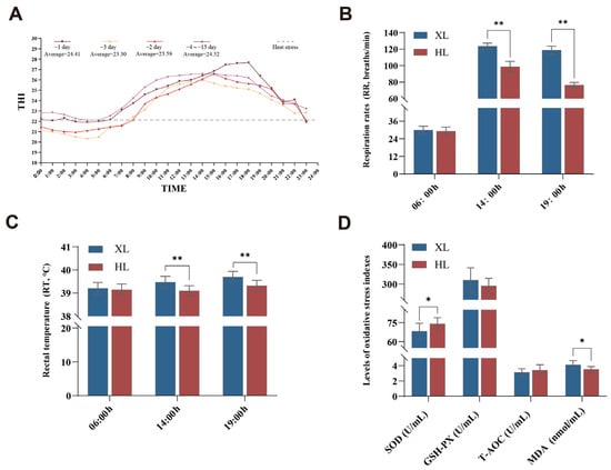 The weather trend before sampling and the measurement of physiological and antioxidant parameters in XL and HL groups during high-temperature conditions. (A) THI changes fifteen days prior to sampling, with −1 indicating the day before sampling, and so forth. Average represents the daily average THI, and the red dotted line marks the heat stress threshold; (B) respiration rates (RR); (C) rectal temperatures (RT); (D) levels of oxidative stress indexes; XL: Xinggao sheep; HL: Hu sheep; * p < 0.05, ** p < 0.01.