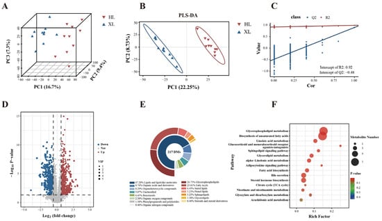 (A) Principal component analysis (PCA); (B) partial least squares discriminant analysis (PLS-DA); (C) PLS-DA permutation test plot; (D) volcano plot showing significant differences in metabolites between treatments selected by PLS-DA (VIP > 1, p < 0.05, FC = 1.5 or 1/1.5); (E) biochemical categories of identified differential metabolites are displayed in a pie chart; (F) enrichment pathways of differential serum metabolites in XL and HL groups under heat stress conditions.