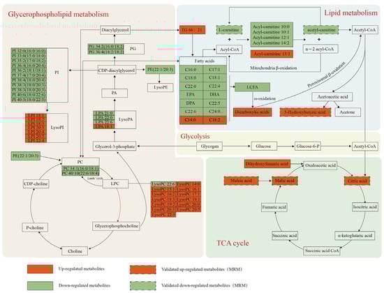 The mass spectrometry data were preprocessed using XCMS 3.5.1 software (Scripps Research, La Jolla, CA, USA), including peak extraction, grouping, retention time correction, a second round of grouping, and isotopic adduct annotation. After converting raw LC-MS files to mzXML format, data processing was performed in R using XCMS, CAMERA, and metaX. The normalized LC-MS data were analyzed using SIMCA-P 13.0 (Umetrics, Umea, Sweden) for multivariate analysis, including unsupervised principal component analysis (PCA) and supervised partial least squares discriminant analysis (PLS-DA) to examine metabolite changes between groups. Model evaluation was based on R2X and R2Y for explained X and Y variation and Q2 for predictive ability, with values above 0.5 indicating an acceptable model. Differential metabolites (DMs) were identified using PLS-DA variable importance in projection (VIP > 1), Student’s t-test (p < 0.05), and the fold-change (FC) values of each metabolite between the two groups were calculated. The DMs were further annotated using the KEGG database, and enrichment pathway analysis results were mapped.