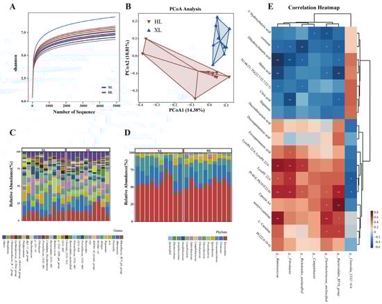 (A) Differential analysis of gut microbiota in the XL group and HL group under heat stress conditions. rarefaction of the different samples; (B) differences in principal coordinate analysis (PCoA) of intestinal microbiome XL and HL groups. The red dots represent the samples of the XL group, and the blue dots represent the samples of the HL group. The distance between the two points represents the difference in intestinal microbiota; (C) the taxonomic distribution between XL group and HL group samples (each color represents the relative abundance of a taxonomic bacterium). Between-group at the phylum level (top 14); (D) between-group at the genus level (top 30); (E) heatmap of correlations between gut microbiota and differential metabolites. Red indicates a positive correlation, blue indicates a negative correlation; * p < 0.05, ** p < 0.01.