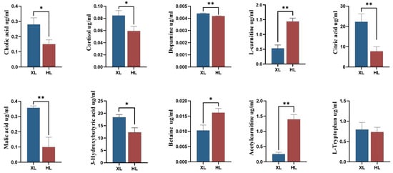 The UHPLC-MRM-MS analysis results confirmed that in the bile secretion pathway, the levels of bile acids, COR, and DA in the XL group were significantly higher compared to the HL group, and the LC level was also significantly reduced. Metabolites related to the tricarboxylic acid cycle, such as citric, malic, and maleic acids, were also significantly elevated. Other metabolites related to heat stress, such as 3-hydroxybutyrate, were significantly increased, while betaine and acylcarnitines were significantly decreased. Although we observed a significant change in the tryptophan pathway in the non-targeted metabolomics data, no significant change in the level of L-tryptophan was found in the quantitative detection (Figure 5).