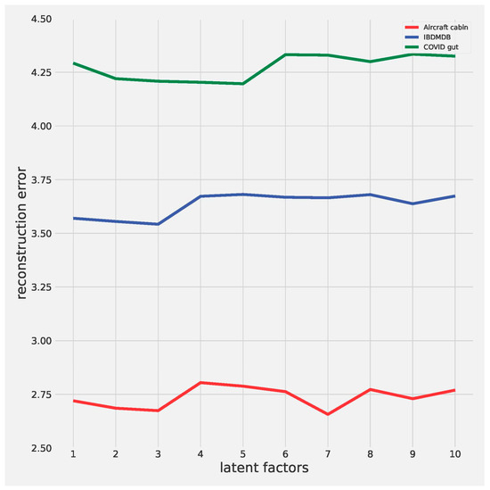 Basic CMTF performance using different numbers of latent factors. Aircraft cabin: Aircraft Cabin Dust Microbiome and Metabolome Dataset; IBDMDB: Inflammatory Bowel Disease Multi-omics Dataset; COVID gut: Gut Microbiome and Metabolome Data of COVID-19 Patients Dataset.