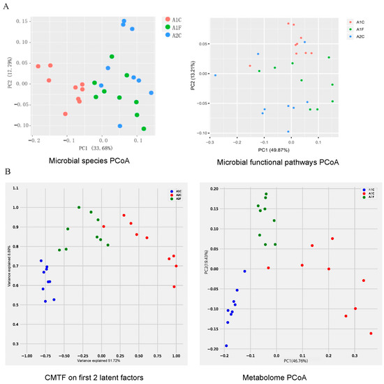 Dimension reduction performance comparison on aircraft database. (A) dimension reduction of microbiome data at species and pathway level. (B) Dimension reduction comparison between CMTF and metabolome-based PCoA.