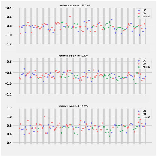 We factorized the microbiome/metabolome datasets into three latent factors. Each of these latent factors explained a comparable amount of variance (Figure 4). Using the top two latent factors, we further visualized and quantified the group separation between IBD and non-IBD subjects. Notably, while the UC (ulcerative colitis) and CD (Crohn’s disease) groups did not show significant separation (p = 0.152, F-test), both the UC vs. non-IBD (p = 0.002, F-test) and CD vs. non-IBD (p = 0.008, F-test) showed significant separation. In contrast, the original paper’s PCoA and PERMANOVA analysis failed to demonstrate a statistical difference between UC/CD and non-IBD groups (p > 0.05). Therefore, CMTF provided a more pronounced separation than PCoA, suggesting that it is more effective at capturing key microbial and metabolomic drivers that differentiate IBD from non-IBD subjects.