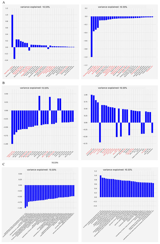 Biomarker identification (features loadings) on the first 2 latent factors of CMTF on the IBDMDB dataset. Negative loadings represent a negative association with latent factors. (A) Microbe loadings (B), metabolite loadings, and (C) functional pathway loadings. Texts in red font indicate validated biomarkers.