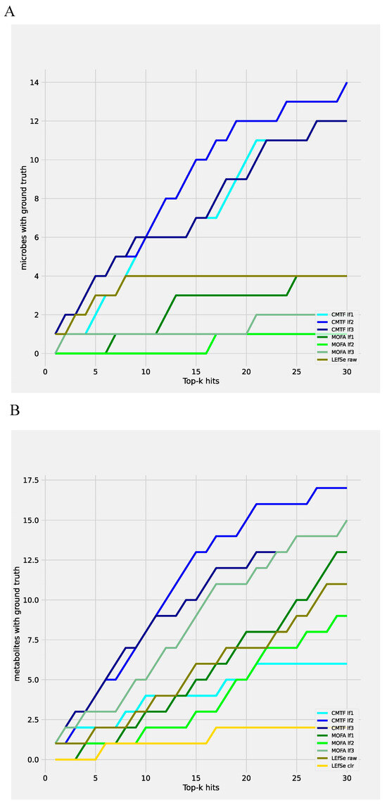 We further benchmark the efficacy of CMTF against some state-of-the-art biomarker identification programs, including LEfSe [11] and MOFA2 [17,18] in detecting true positive biomarkers. For the evaluation, we selected the top ‘k’ potential biomarkers and counted the number of those validated. In all latent factors, CMTF outperformed LEfSe and MOFA2 in the efficiency of detecting validated microbes (Figure 6A). Additionally, CMTF outperformed LEfSe in the efficiency of detecting validated metabolites in all but one latent factor, while MOFA2 becomes competitive with CMTF in detecting metabolites (Figure 6B). These findings highlight CMTF’s robustness and a high true positive rate in biomarker identification.