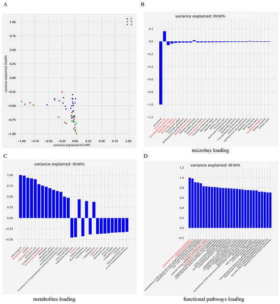 Analysis of COVID-19-related gut dataset. (A) Dimension reduction result of CMTF on COVID-19-related gut dataset. The figure was visualized on the first two latent factors. (B) Microbes, (C) metabolites, and (D) pathway loadings on the second latent factor.