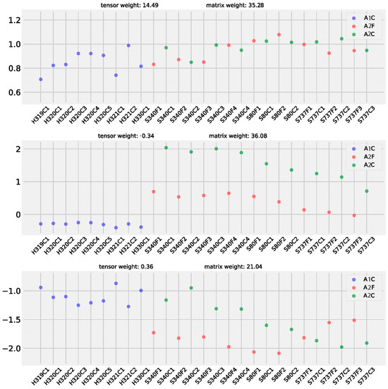 To investigate the impact of different numbers of latent factors on the factorization results, we applied the basic CMTF framework to the three datasets mentioned above using a range of number of latent factors from 1 to 10 (Figure 1). The results showed that all three datasets achieved sufficiently good factorization results with low RMSE when the number of latent factors was set to 3. Considering the balance between model complexity and performance, we set the number of latent factors to three for subsequent analysis on three datasets. The slight variability in RMSE across datasets may stem from differences in data complexity, encompassing factors such as dimensionality, heterogeneity of biological signals, and overall variability. Datasets with higher dimensionality or more diverse profiles can pose greater challenges for factorization, potentially yielding higher reconstruction errors.