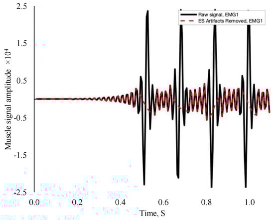 Example filtered electromyography signal. The black line represents the electrical stimulation signal, while the red dash line represents EMG data reconstruction and independent muscle activity.