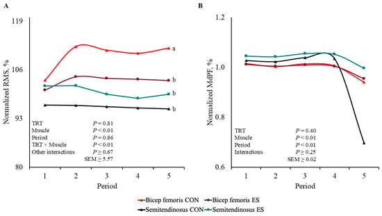 There were no interactions or TRT main effect for the MdPF normalized value (p ≥ 0.25; Figure 2B), but there were Muscle and Period main effects (p < 0.01). Bicep femoris had smaller values (p < 0.01) of MdPF than that of ST. The percentage of MdPF decreased (p < 0.01) by Period 5 compared to that of the other Periods, which did not differ from each other (p ≥ 0.38).