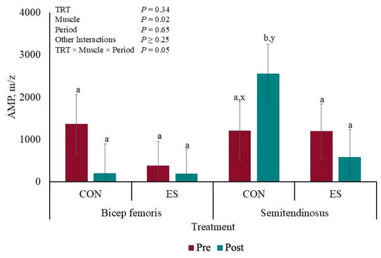 There was a TRT × Muscle × Period interaction for muscle concentration of AMP (p = 0.05; Figure 3). The concentration of AMP was greater (p ≤ 0.05) post-EMS in CON ST compared to that of the other AMP concentrations, which were not different from each other (p ≥ 0.11); however, the AMP concentration of CON ST tended to differ pre- and post-EMS (p = 0.07).