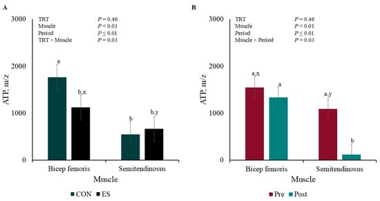 Pre- and post-muscle electrical stimulation adenosine triphosphate (ATP; A) Treatment × Muscle and (B) Muscle × Period interactions of barrows subjected to an electrical stunner super-contraction (ES) or not (CON). a,b Means within a panel with different subscripts differ (p ≤ 0.05). x,y Means within a panel with different subscripts tended to differ (0.05 < p < 0.10).