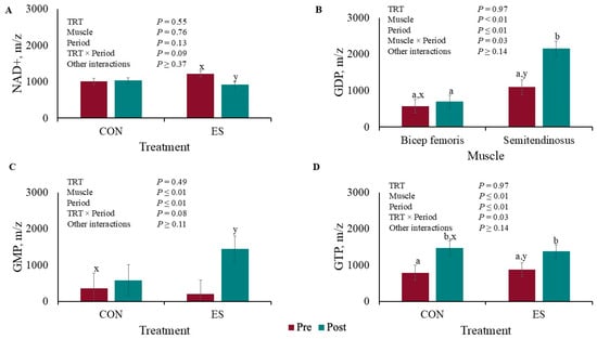 Liquid chromatography–mass spectrometry redox panel of (A) NAD+, (B) GDP, (C) GMP, and (D) GTP before and after muscle electrical stimulation of barrows subjected to an electrical stunner super-contraction (ES) or not (CON). a,b,c,d Means within a panel with different subscripts differ (p ≤ 0.05). x,y Means within a panel with different subscripts tended to differ (0.05 < p < 0.10).
