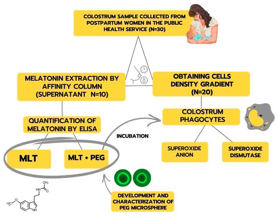 PEG microspheres combined with the hormone melatonin can modulate the activity of colostrum phagocytes in the presence of Enteropathogenic Escherichia coli (EPEC), one of the main causes of enteric infections in children [11,12]. Melatonin enhances the functional activity of these phagocytes, highlighting the importance of colostrum’s bioactive components for immune protection [13]. While colostrum and human milk are known to combat infections, research on the effects of colostrum-derived melatonin on cellular oxidative metabolism is lacking. Considering that colostrum and human milk effectively combat intestinal and respiratory infections, it is possible that the melatonin present in these secretions interacts with the mononuclear (MN) phagocytes and enhances their functional activity against bacterial infections. This study aimed to extract melatonin from human colostrum, develop and characterize PEG microspheres with the extracted melatonin adsorbed onto them, and evaluate the effects of this system on the oxidative metabolism of colostrum phagocytes.