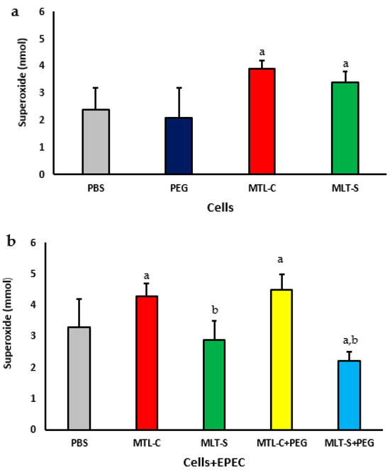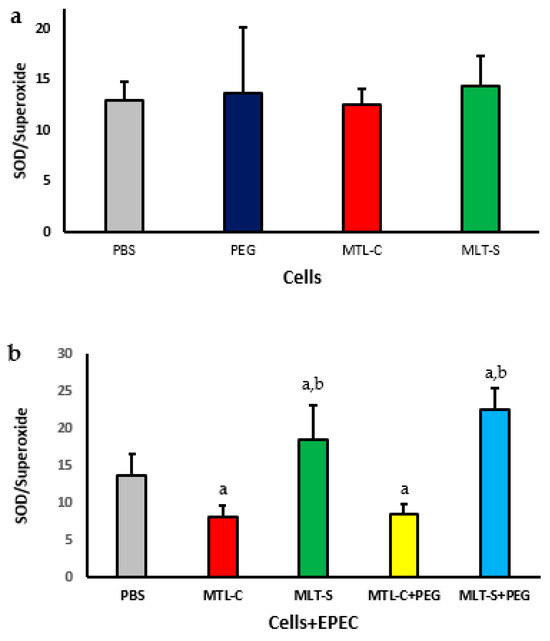 SOD/superoxide ratio in human colostrum MN phagocytes with colostrum melatonin and synthetic melatonin (a). Results represent the mean and standard deviation of 20 colostrum samples. It also presents the ratio for MN phagocytes exposed to EPEC (enteropathogenic Escherichia coli) and treated with PEG microspheres containing either type of melatonin (b), with p < 0.05. The letter “a” highlights differences in enzyme levels between the PBS group and those treated with colostrum-derived melatonin (MLT-C), synthetic melatonin (MLT-S), or PEG microspheres (MLT-C-PEG and MLT-S-PEG). Letter “b” indicates the differences between the PEG microspheres with colostrum melatonin (MLT-C-PEG) and those with synthetic melatonin (MLT-S-PEG).