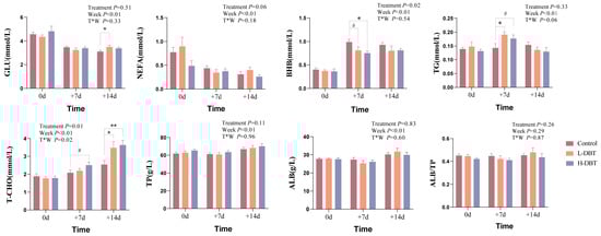 Blood biochemical indices of the control, L-DBT, and H-DBT groups. Horizontal and vertical coordinates show the different time points and measured indices, respectively. Brown, yellow, and blue columns represent the control, L-DBT, and H-DBT groups, respectively (0.05 < # p < 0.1; * p < 0.05; ** p < 0.01).