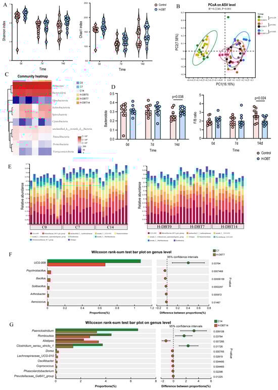 Intestinal flora represents the core of TCM studies. By analysing faecal 16S rRNA in late periparturient dairy cows, the effect of DBT on the gut microbial communities was determined. The richness and evenness indices of faecal microbiota, including Shannon and Chao1 diversity indices, did not significantly differ between the control and H-DBT groups at any time point (Figure 2A). However, principal coordinate analysis (PCoA) showed a clear separation between the C14 and H-DBT14 groups (p = 0.005; Figure 2B), indicating that DBT did not significantly change the bacterial diversity but altered the overall microbiota structure.